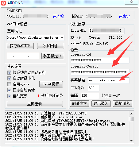 此程序可以将点晴OA服务器所在路由器的动态公网IP实时更新到阿里云域名服务器,打开后界面如下: