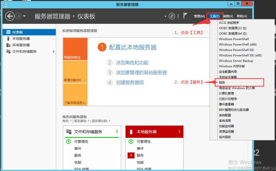 首先要把 SQL Server 的服务都关掉,通过 Windows Server最下面搜索框搜索 【服务器管理器】 并打开,点击【工具】——>【服务】(或者同时按住 Win + R 键,在弹出的运行框里面输入【services.msc】命令也可以进入到【服务】)