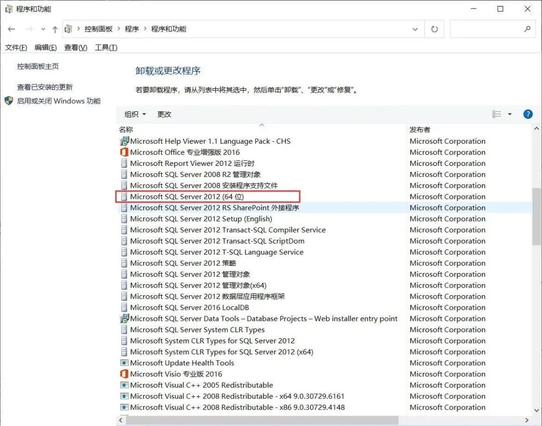 先找到 Microsoft SQL Server 2012(64-bit) 鼠标【右键】-【卸载/更改】(其他版本找到对应的 (64位) 程序,如:SQL Server 2019 就找 Microsoft SQL Server 2019(64-bit))