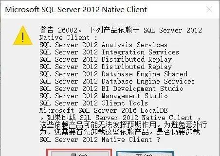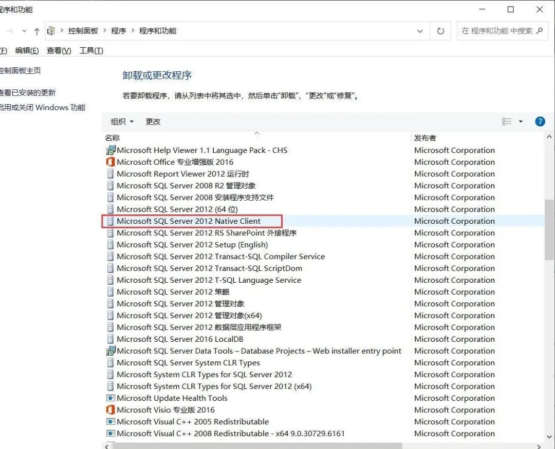 找到 Microsoft SQL Server 2012 Native Client 鼠标【右键】-【卸载】,在弹出的对话框中选择【是】(其他版本找对应的 Native Client 程序,如:SQL Server 2019 就找 Microsoft SQL Server 2019 Native Client)