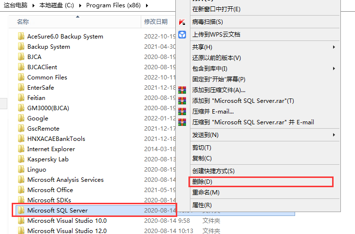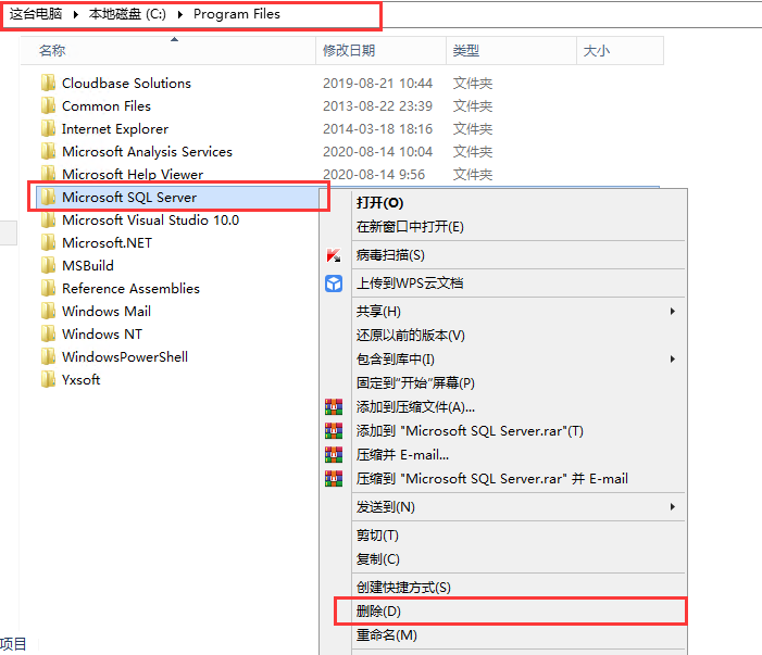 找到自己的之前安装 Microsoft SQL Server 的目录(默认安装的在 C 盘)鼠标【右键】-【删除】,然后进入C:\Program Files 文件夹下,找到 Microsoft SQL Server 文件夹 鼠标【右键】-【删除】