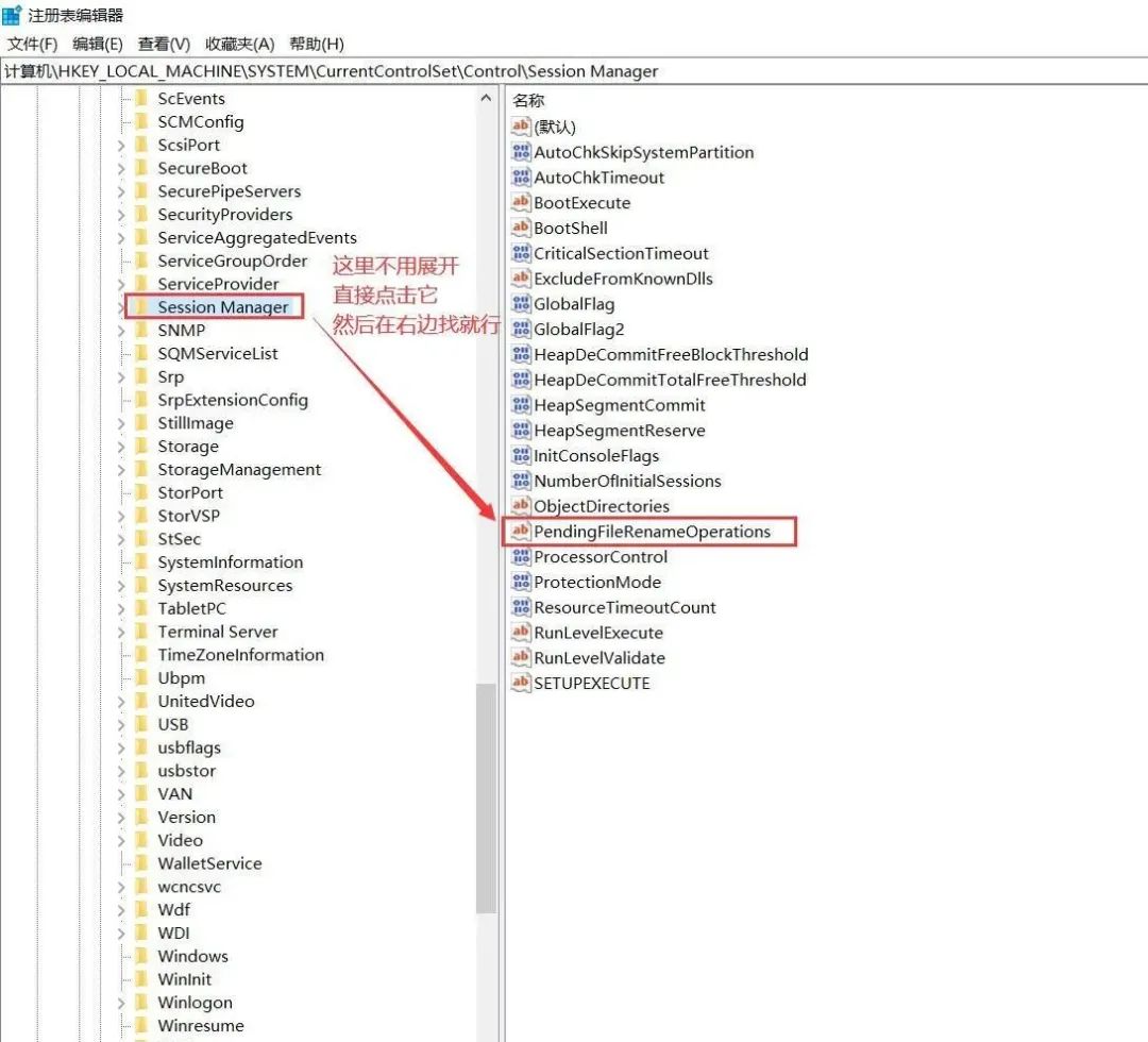 在刚刚展开的列表里面找到 Session Manager ,在右边找到 PendingFileRenameOperations 鼠标【右键】-【删除】