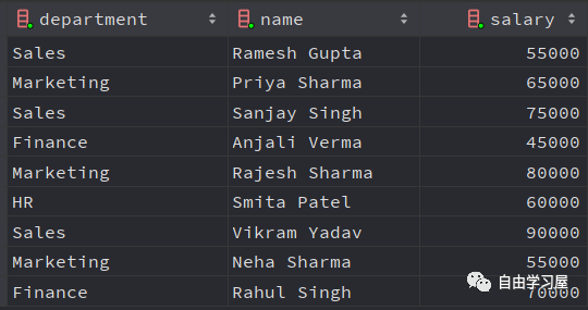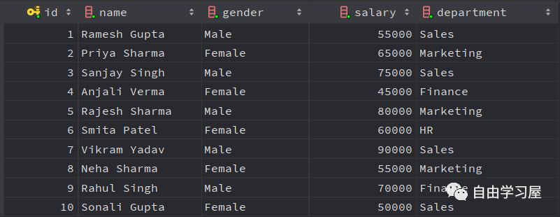 insert INTO employees (name, gender, salary, department)VALUES ('Ramesh Gupta', 'Male', 55000, 'Sales'),       ('Priya Sharma', 'Female', 65000, 'Marketing'),       ('Sanjay Singh', 'Male', 75000, 'Sales'),       ('Anjali Verma', 'Female', 45000, 'Finance'),       ('Rajesh Sharma', 'Male', 80000, 'Marketing'),       ('Smita Patel', 'Female', 60000, 'HR'),       ('Vikram Yadav', 'Male', 90000, 'Sales'),       ('Neha Sharma', 'Female', 55000, 'Marketing'),       ('Rahul Singh', 'Male', 70000, 'Finance'),       ('Sonali Gupta', 'Female', 50000, 'Sales');