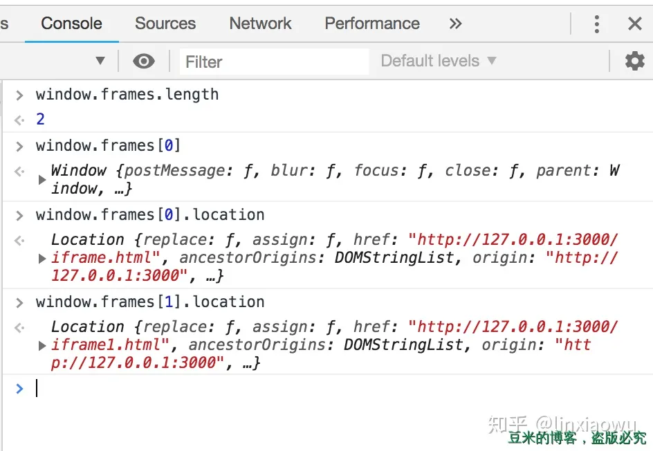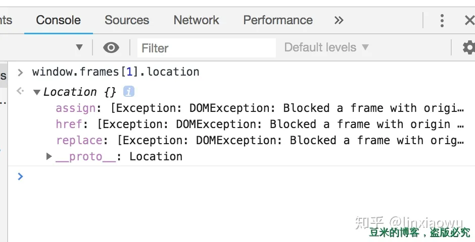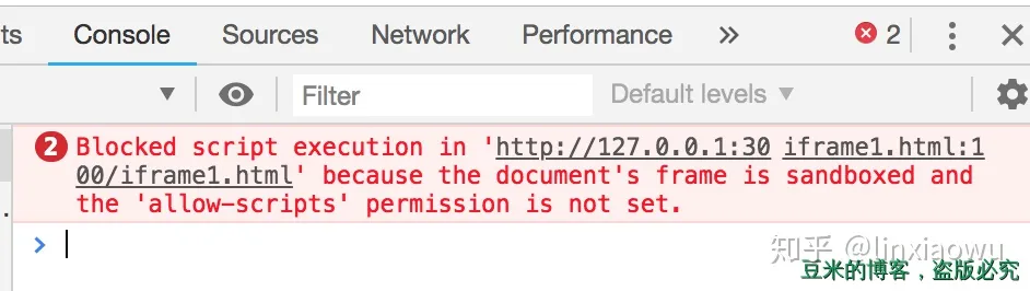 如果有一个iframe是处于沙箱模式,并且没有设置allow-same-origin,那么虽然你可以访问到window.frames的长度为2,但是当你获取window.frames[1].location的时候会有这样的错误: