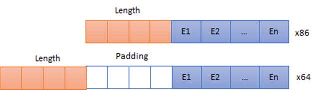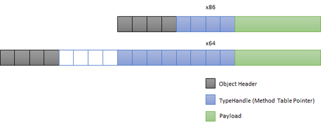 如下图所示,对于32位(x86)系统,Object Header和TypeHandle各占据4个字节;但是对于64位(x64)来说,存储方法表指针的TypeHandle自然扩展到8个字节,但是Object Header依然是4个字节,为了确保TypeHandle基于8字节的内存对齐,所以会前置4个字节的“留白(Padding)”。
