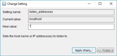 选择“Networking Only”配置组,点击“listen_addresses”进行修改: