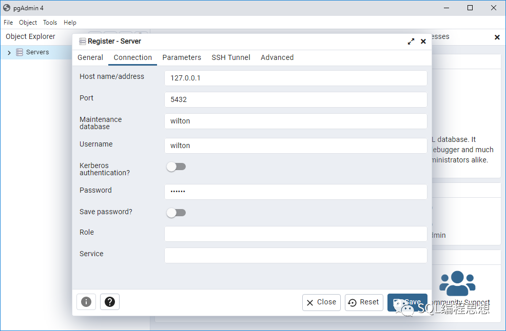 pgAdmin 可以通过 PostgreSQL 协议连接 WiltonDB,默认端口为 5432。