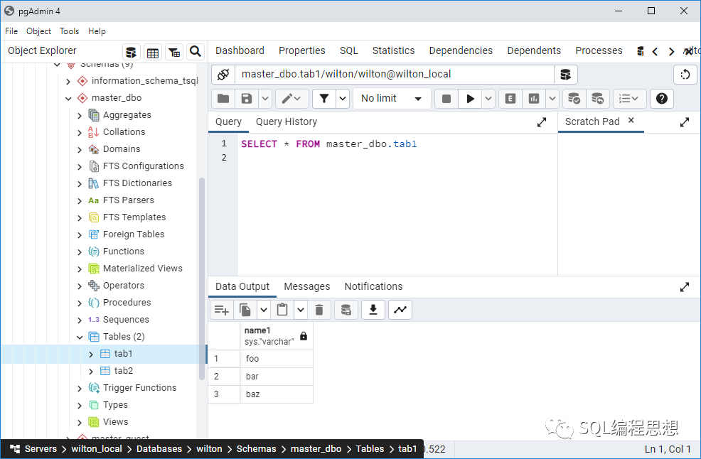 连接成功之后,pgAdmin 可以查看和操作 SSMS 创建的对象。