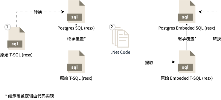 3. Resx文件之间的单向覆盖,减少了需维护SQL的总数量,同时方便扩展至其它方言SQL。