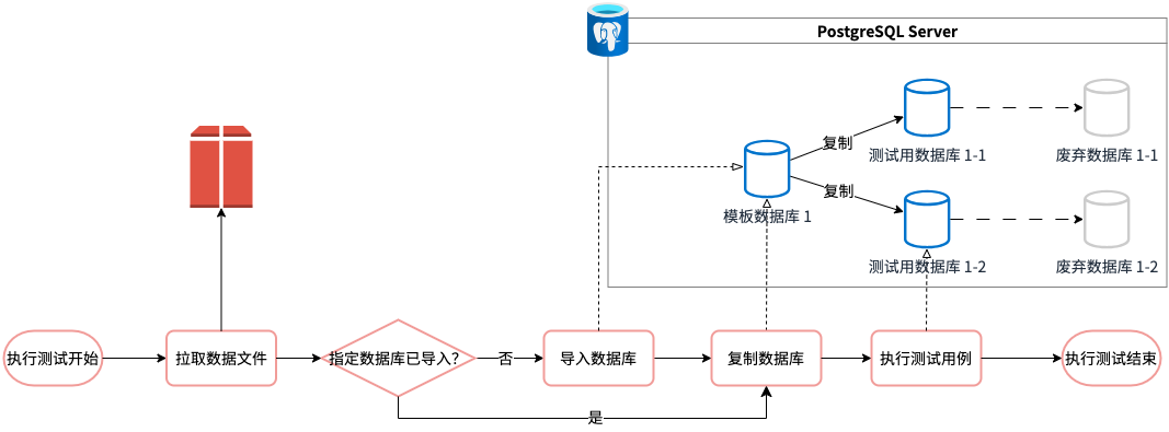 为了加速测试,我们在PostgreSQL上采用模板数据库(Template Database)。同时把数据文件的Hash片段作为Database的名字,测试框架代码就能判断这份数据文件是否已经被导入过。倘若已导入,则跳过导入步骤,直接在PostgreSQL内复制一份数据库供测试使用。