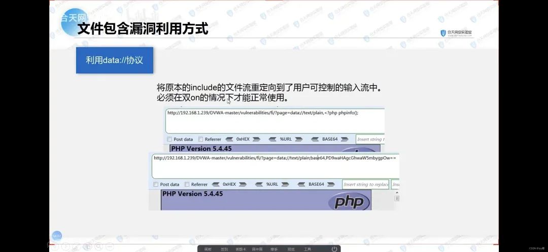 2.远程文件包含(RFI) 包含其他网站上的恶意文件 远程文件包含利用条件:在php.ini中allow_url_fopen=on、allow_url_include=on payload: