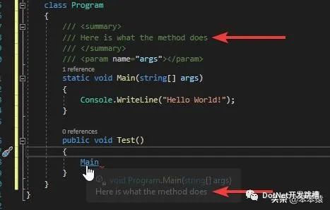 这是我们所有开发人员都讨厌的事情,不是吗?然而,从长远来看,添加几行评论/描述的方法确实能帮助你和其他开发人员。Visual Studio使它变得更加容易,只要在相关的方法上面输入///,VS就会自动为您生成一个包含方法参数的注释模板。