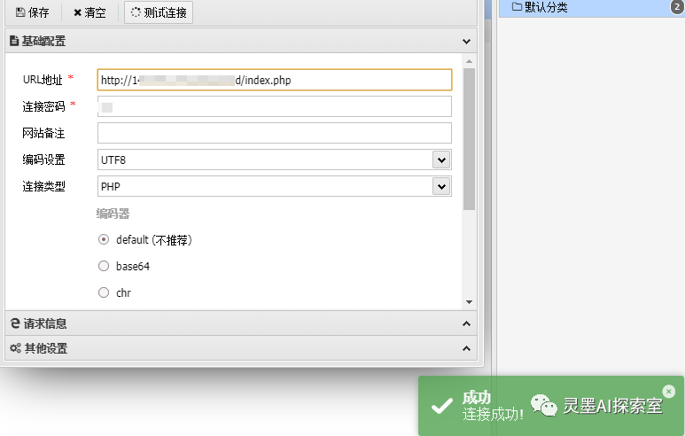 好的,现在我们准备启用我们的秘密武器——蚁剑。只需要输入我攻击脚本中独有的连接密码和脚本文件的URL地址,我就能成功建立连接。连接成功后,你可以将其视为你的远程Xshell,可以随意进行各种操作。