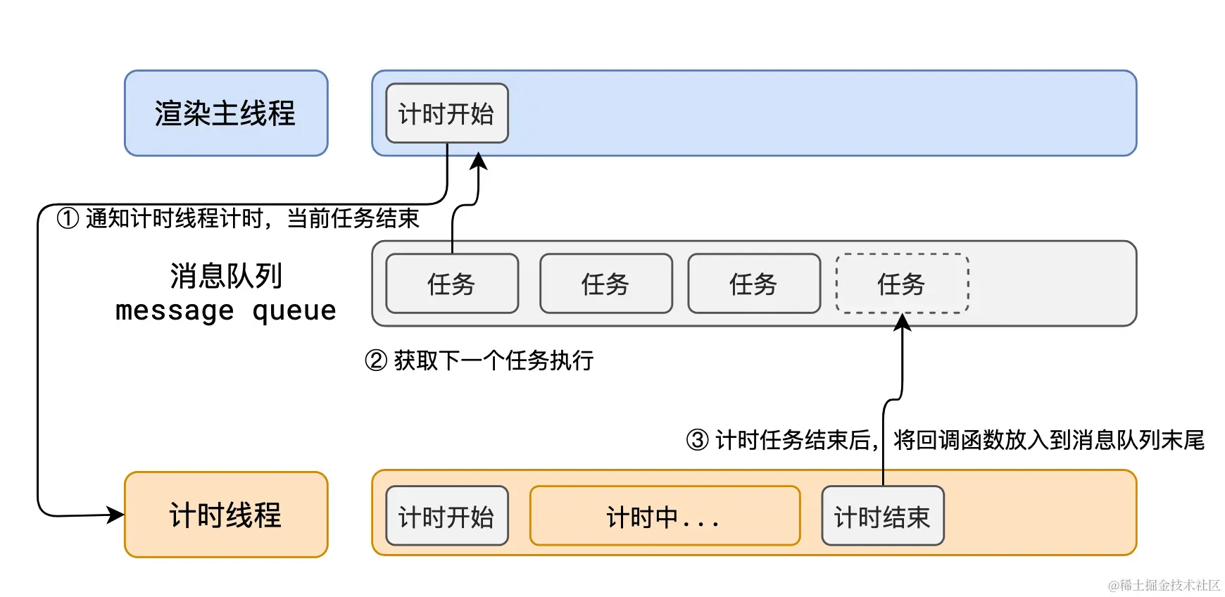 在 Chrome 的源码中,它开启一个不会结束的 for 循环,每次循环从消息队列中取出第一个任务执行,而其他线程只需要在合适的时候将任务加入到队列末尾即可。