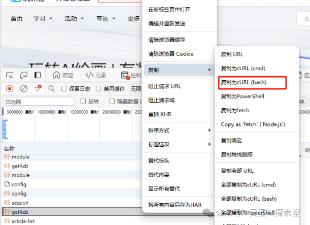 首先,我们在后台查找到目标请求,然后通过右键点击复制该请求。以Edge浏览器为例,具体操作如下所示: