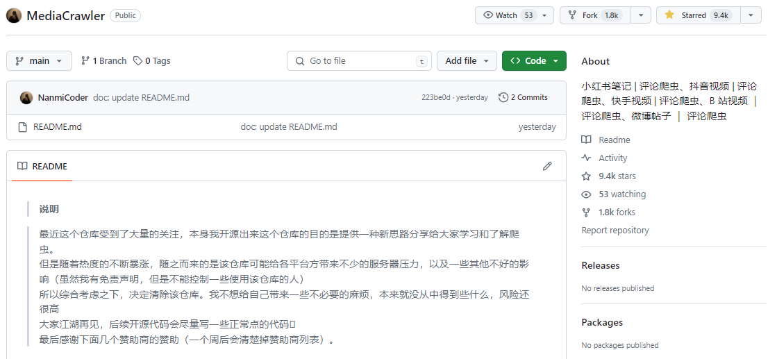 不经意间,来查看MediaCrawler仓库源码,发现作者已经删库了。看来是领奖了。才几天不到的时间Star数量已经直逼10K了,增长速度近乎疯狂。