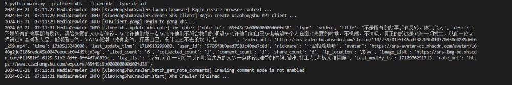 最后运行命令后,会出现一个二维码,比如这里我测试的是小红书,出现二维码之后,我们用小红书App来扫描,并进行确认身份,这样无头浏览器就能识别并记住我们的身份信息,后续就可以通过该身份进行抓取一些数据了。