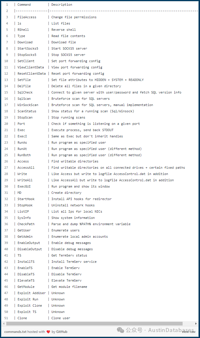 Maggie命令 对恶意软件的分析表明,它伪装成一个名为"sqlmaggieAntiVirus_64.dll"的扩展存储过程DLL文件,该文件由DEEPSoft Co. Ltd数字签名,这家公司似乎位于韩国。扩展存储过程文件通过使用接受远程用户参数并以非结构化数据响应的API扩展SQL查询的功能。Maggie利用这种技术行为,通过一个包含51个命令的丰富设置来实现远程后门访问。 DCSO CyTec的一份报告称,Maggie支持的各种命令可以查询系统信息、执行程序、与文件和文件夹交互、启用远程桌面服务(TermService)、运行SOCKS5代理以及设置端口转发。 攻击者可以为这些命令附加参数,有时Maggie甚至会为支持的参数提供使用说明。