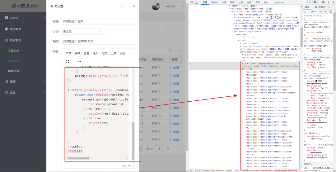 后来才发现代码高亮是需要像prismjs这样的库来进行解析的,我们审查tinymce编辑器的代码块元素后会发现,pre->code标签下他给代码块添加了好多标签及样式,但是
