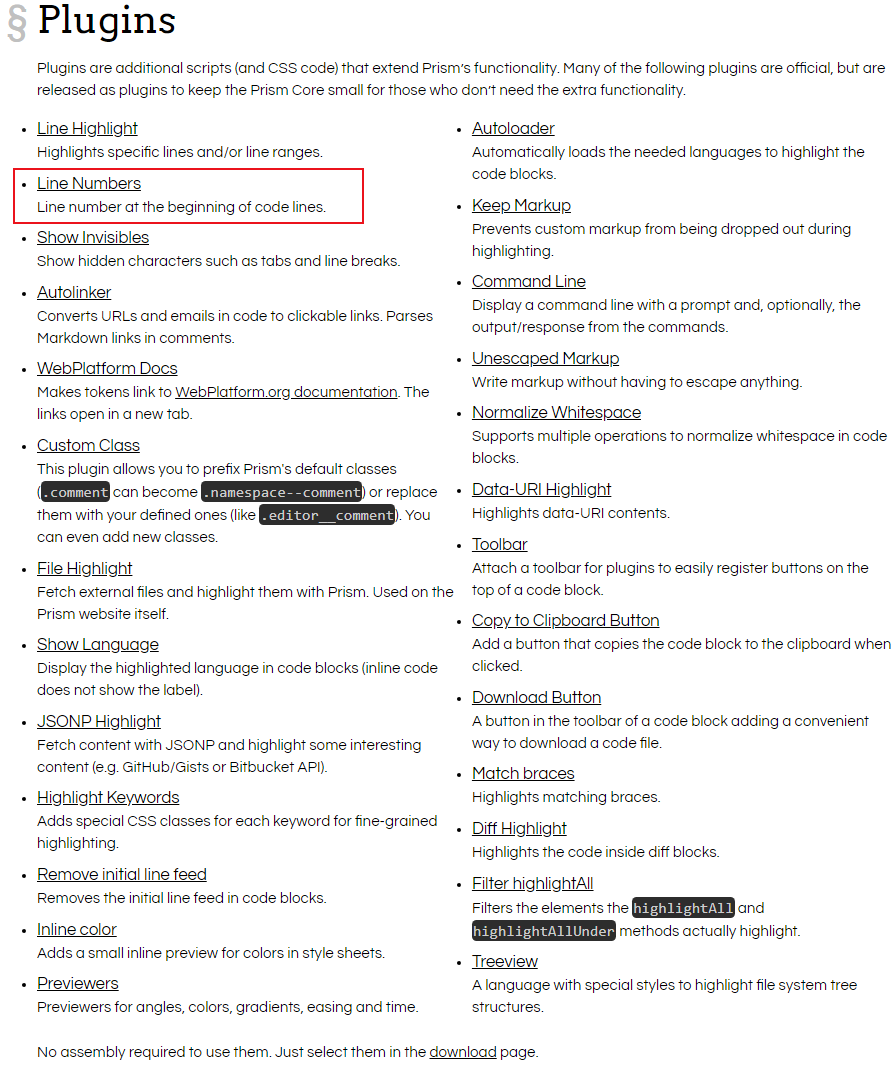 我们可以看到Prism官方 https://prismjs.com/index.html#plugins 提供了一些常用的插件,我们选择红框中的行号