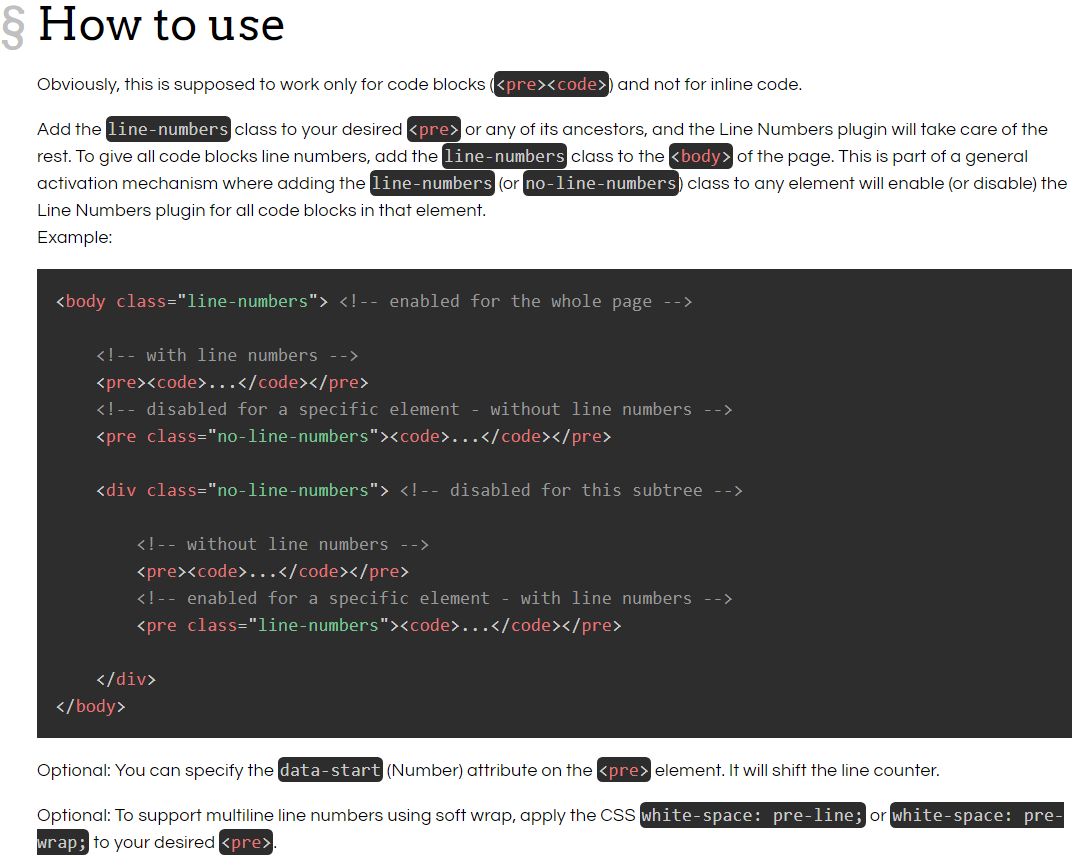 官网已经说得很清楚,除了引入行号插件及样式,我们还需要指定一个line-numbers类,将这个类添加到pre标签或者他的祖先,只要他或他的祖先添加的了line-numbers那么他的子元素就会被行号插件自动添加line-numbers,从而达到添加行号。