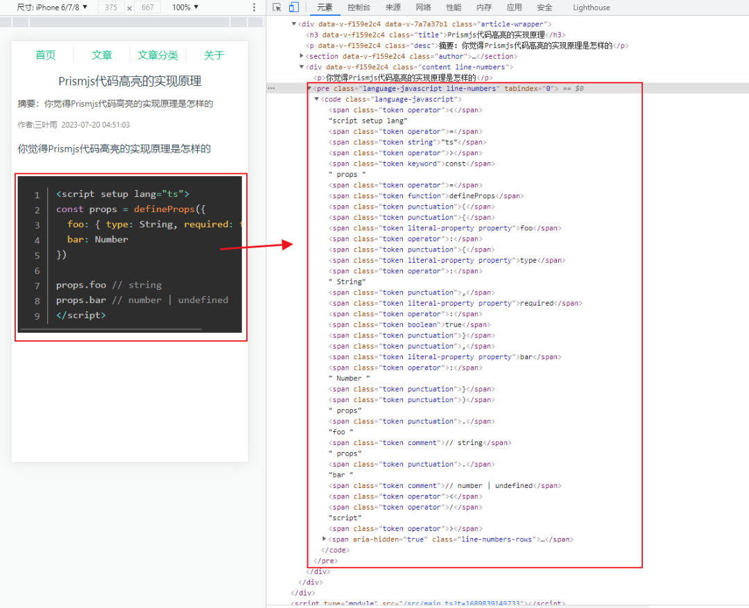 上做了一些处理,我们可以从prismjs的源码中可以发现,获取到pre->code之后,首先获取到pre标签类上的language-xxxx给对应语言的关键字用正则匹配替换或添加标签及相应的样式,这样就达到了代码高亮的效果。