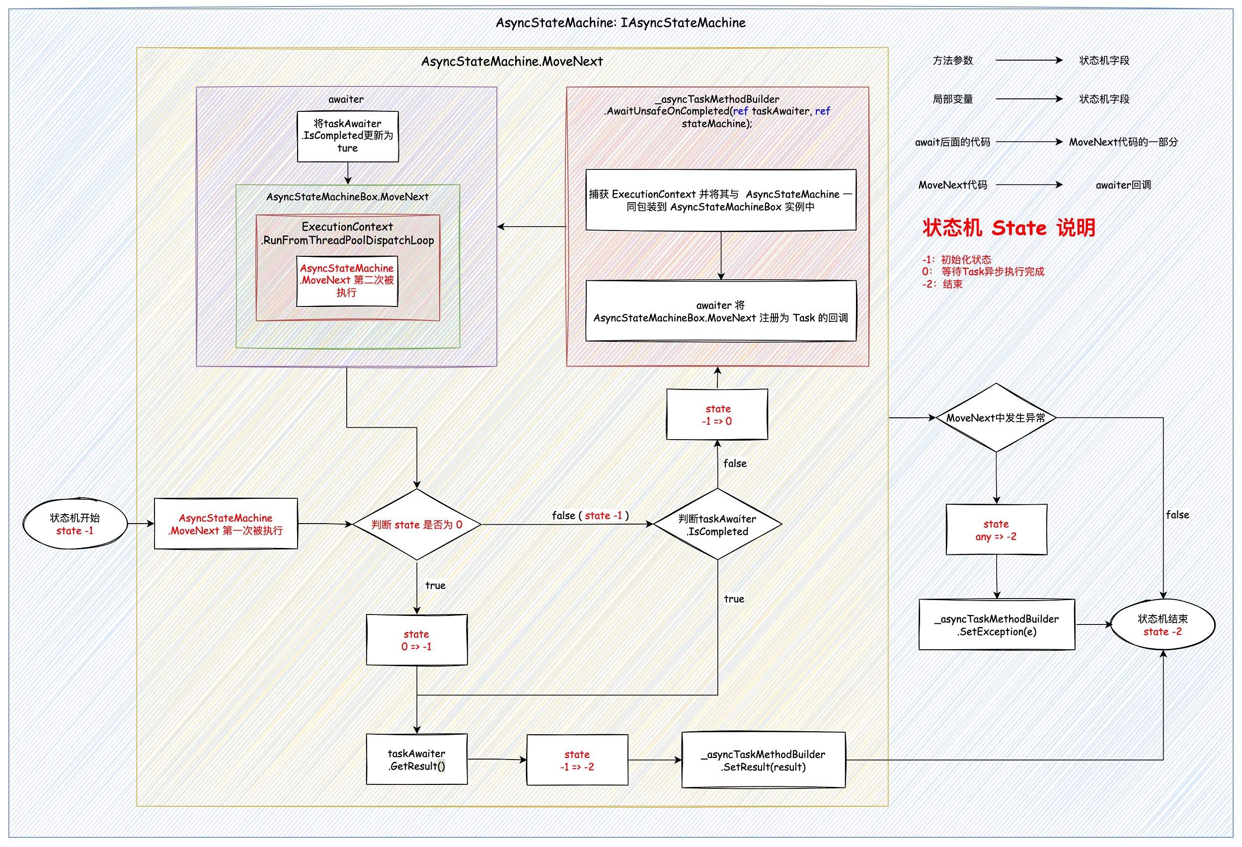 3. 状态机:由编译器生成,每个 async 方法 有且仅有一个,await 后面的代码会被编译到 状态机 的 MoveNext 方法中,注册为 Task 的回调。