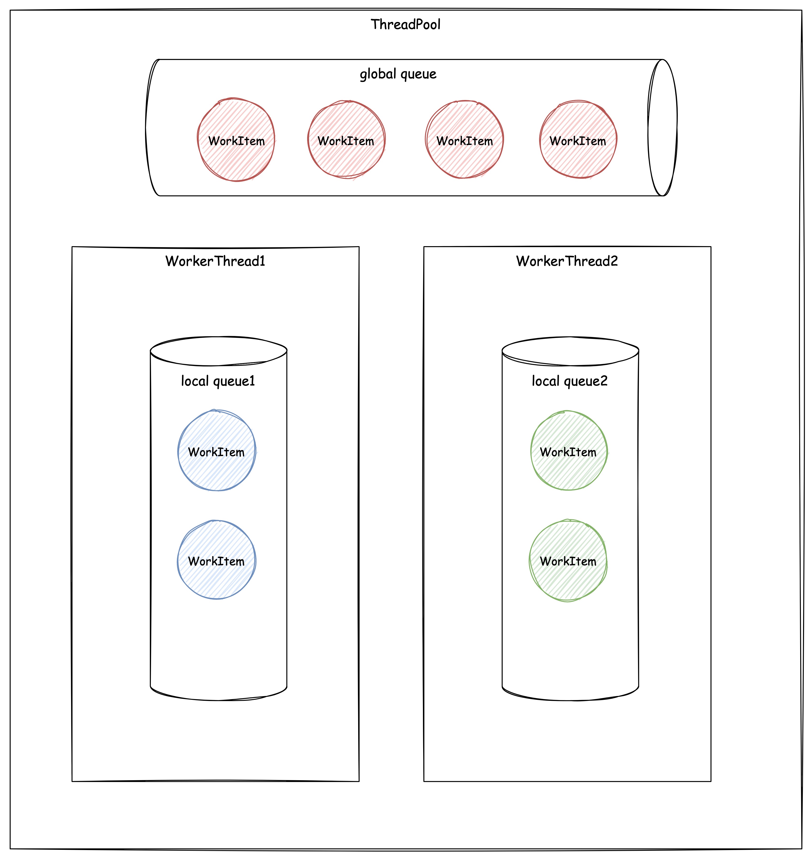 线程池的待执行任务被存放在一个队列系统中。这个系统包括一个 全局队列,以及绑定在每一个 Worker Thread 上 的 本地队列 。而线程池中的每一个线程都在执行 while(true) 的循环,从这个队列系统中领取并执行任务。
