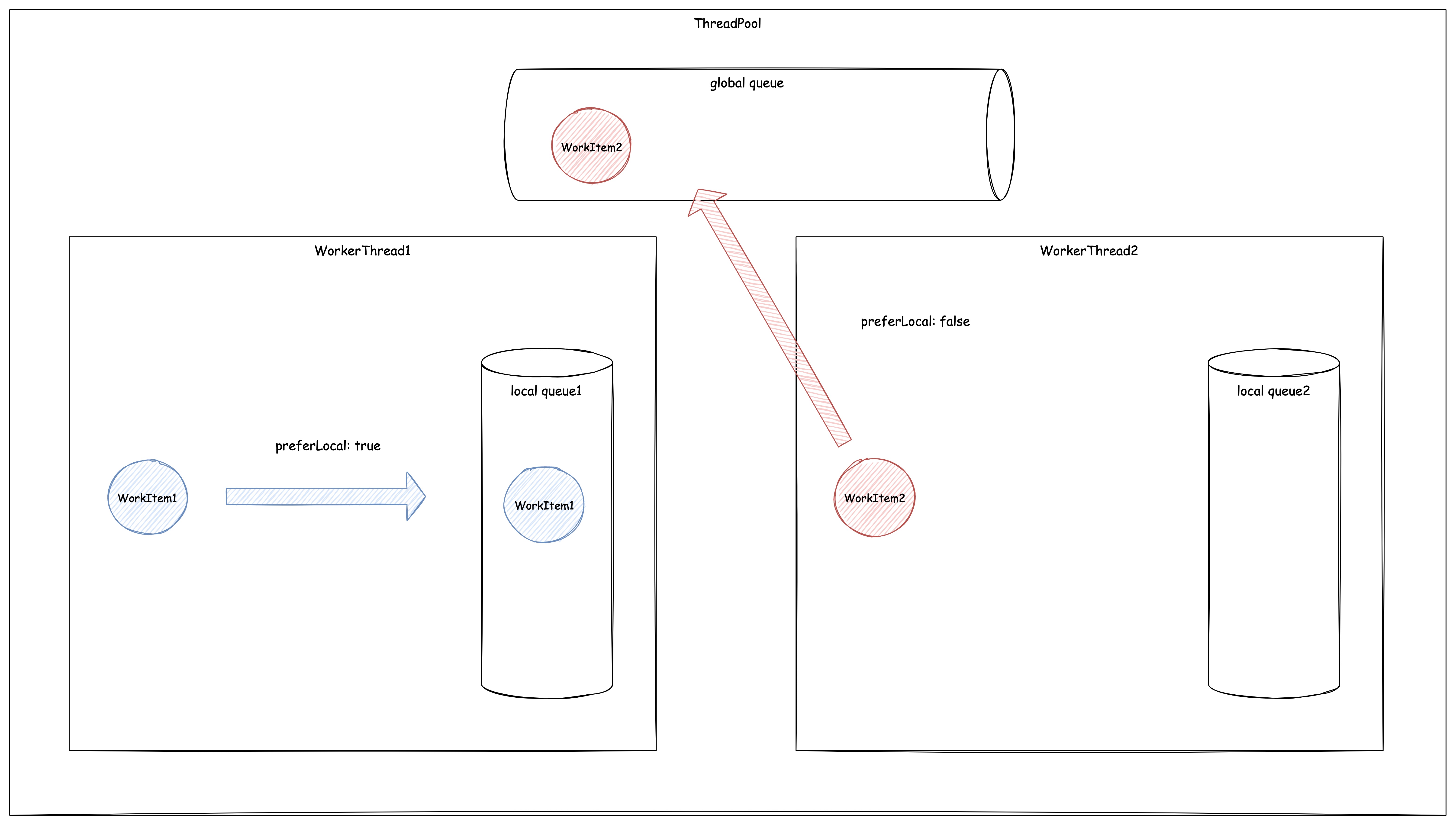 • 在线程池外的线程中调用,不管 preferLocal 传的是什么,任务都会被放到全局队列。