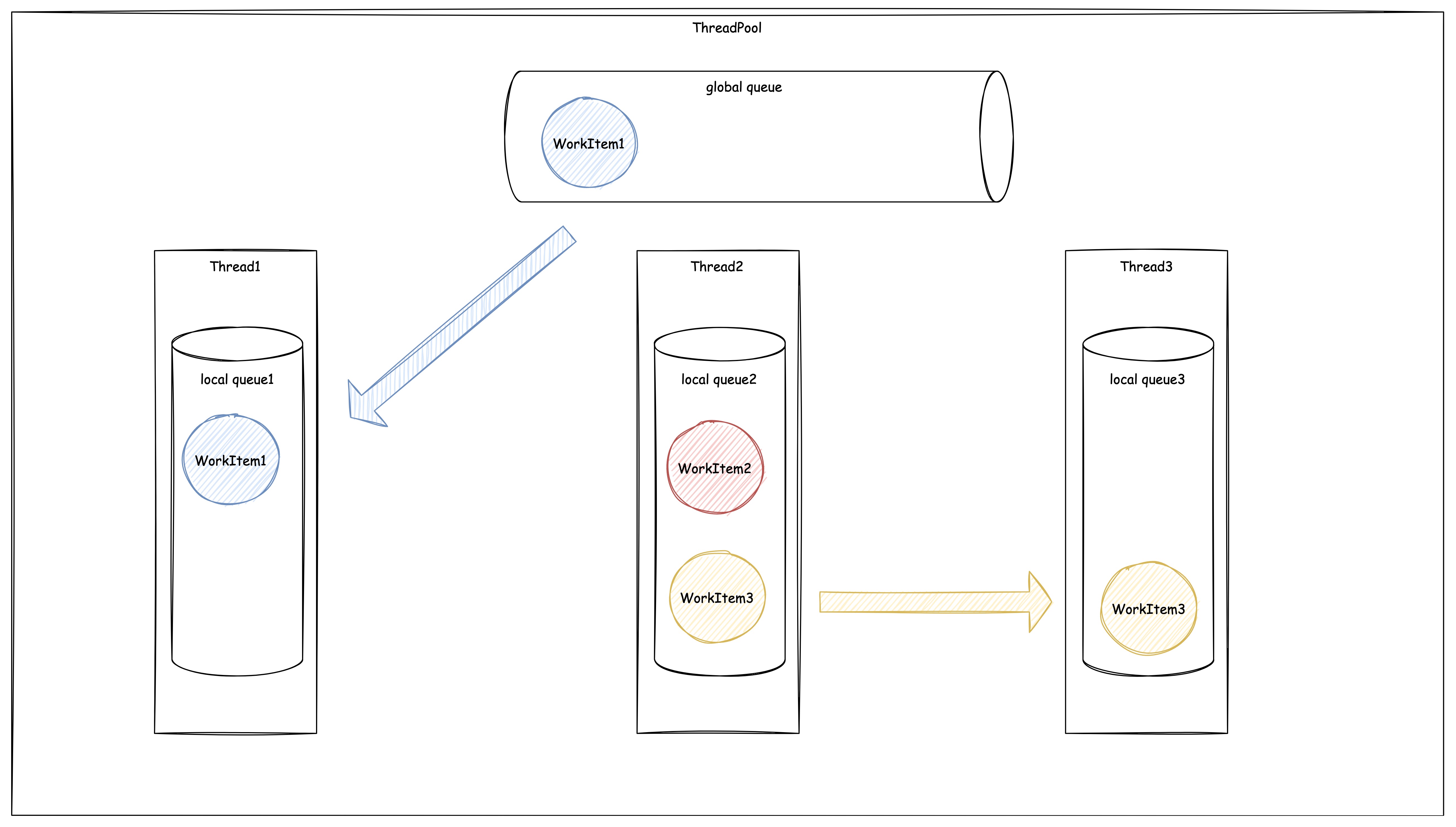 Worker Thread 的 while(true) 中优先会从自身的 WorkStealingQueue 中取任务。如果本地队列已经被清空,就会从全局队列中取任务。例如下图的 Thread1 取全局队列中领取了一个任务。
