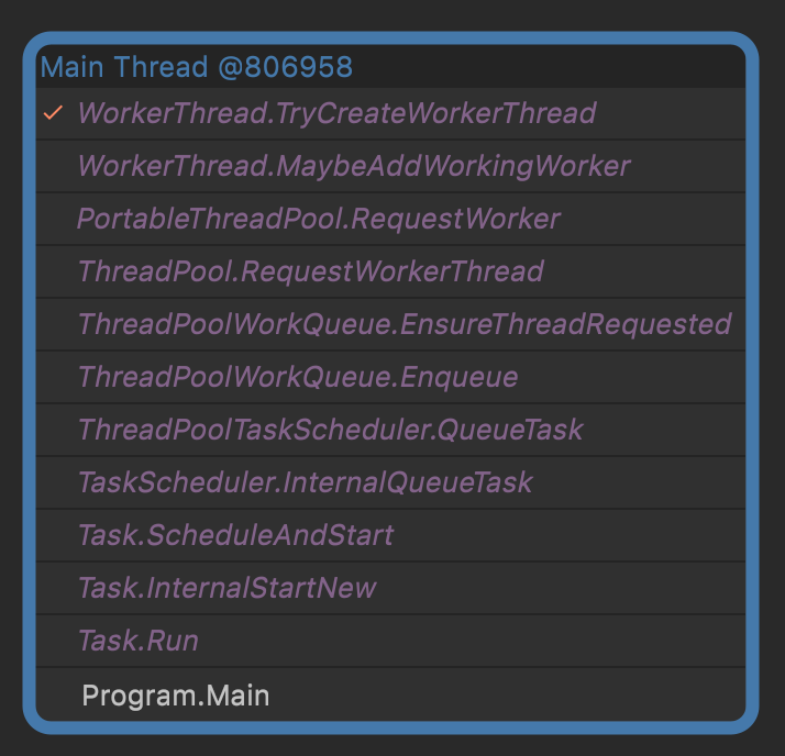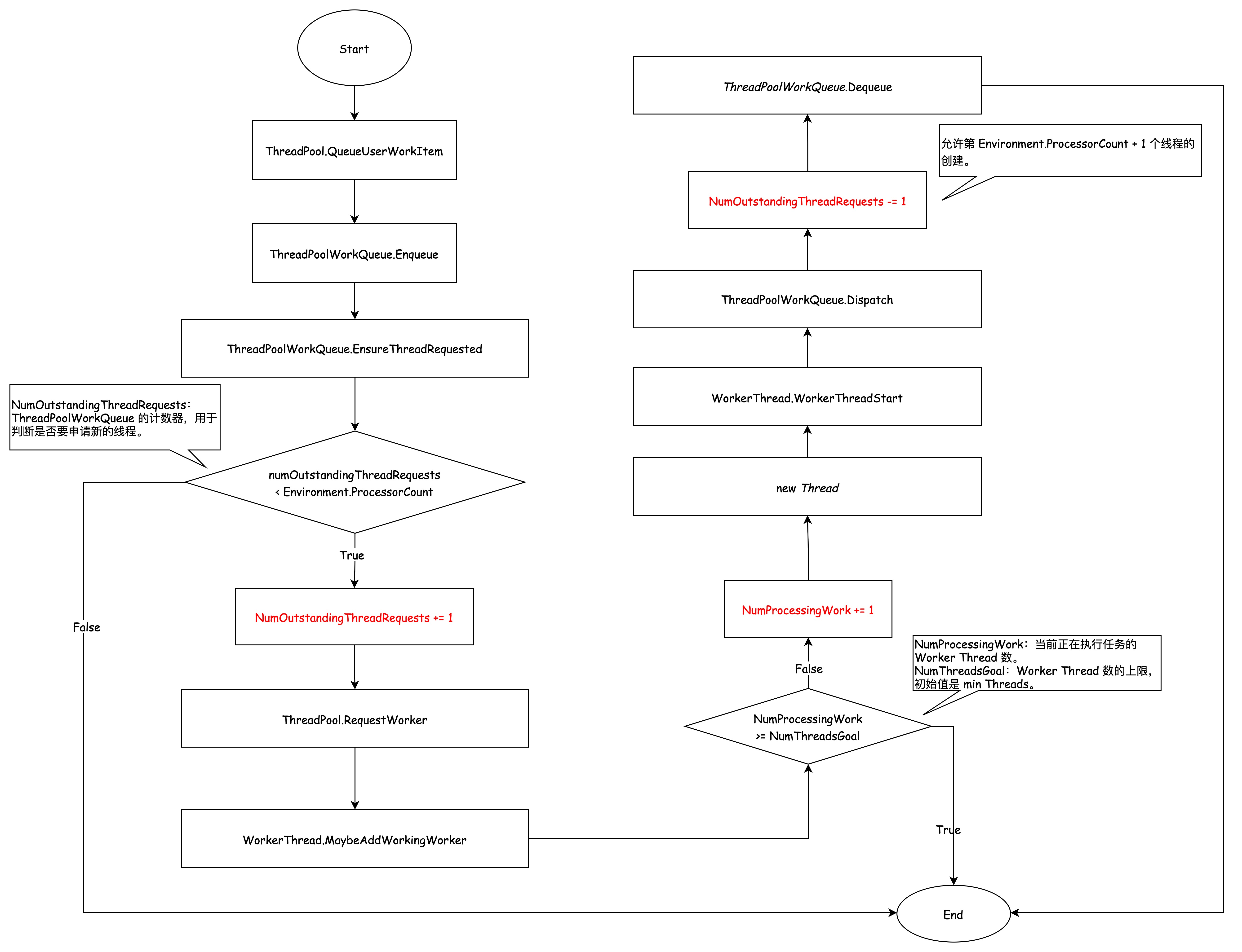 细心的朋友会发现上面代码里 EnsureThreadRequested 方法有一个终止条件,_separated.numOutstandingThreadRequests == Environment.ProcessorCount,每次新增一个 ThreadRequested,这个数就会 +1,似乎允许创建的最大 Worker Thread 是 Environment.ProcessorCount?