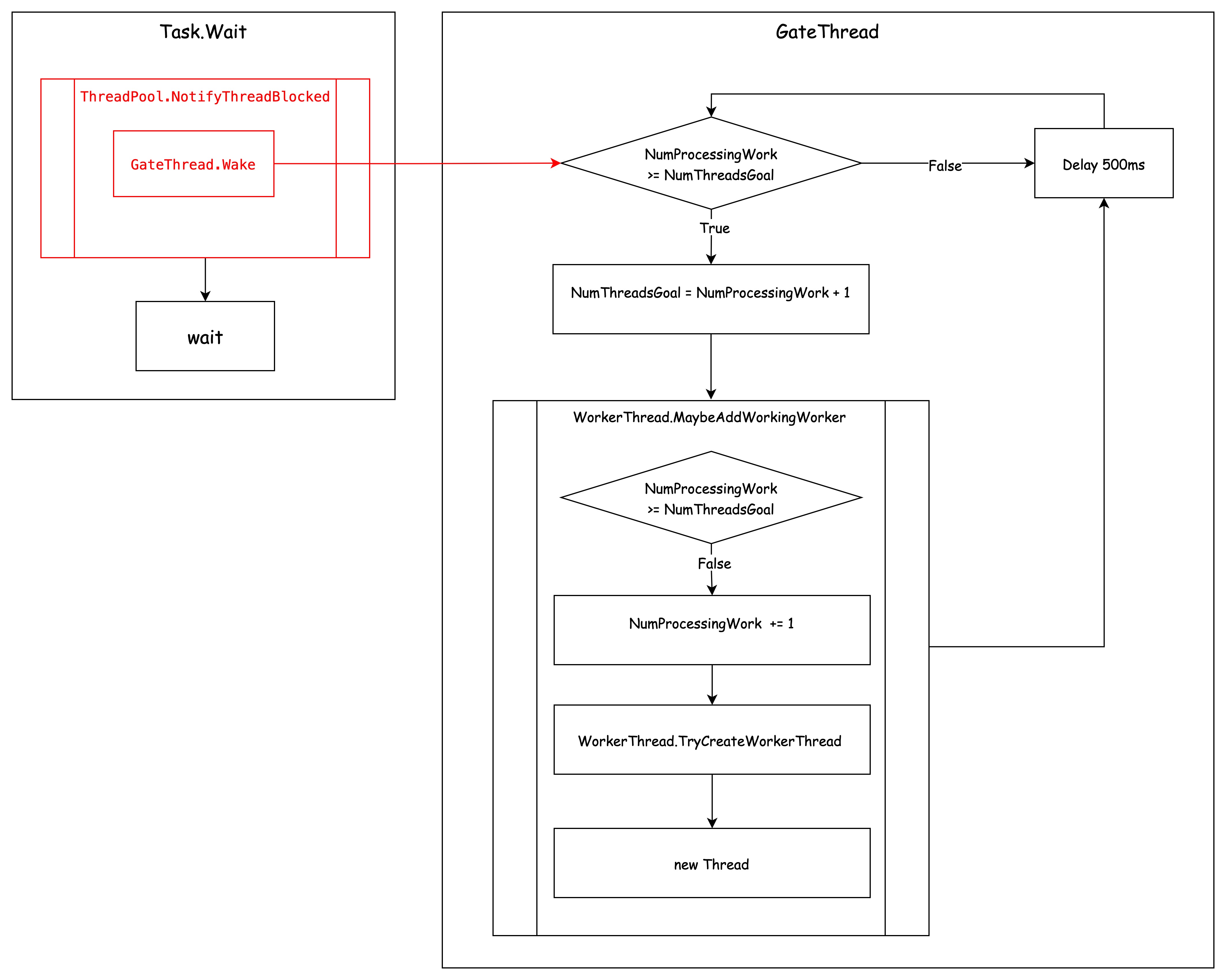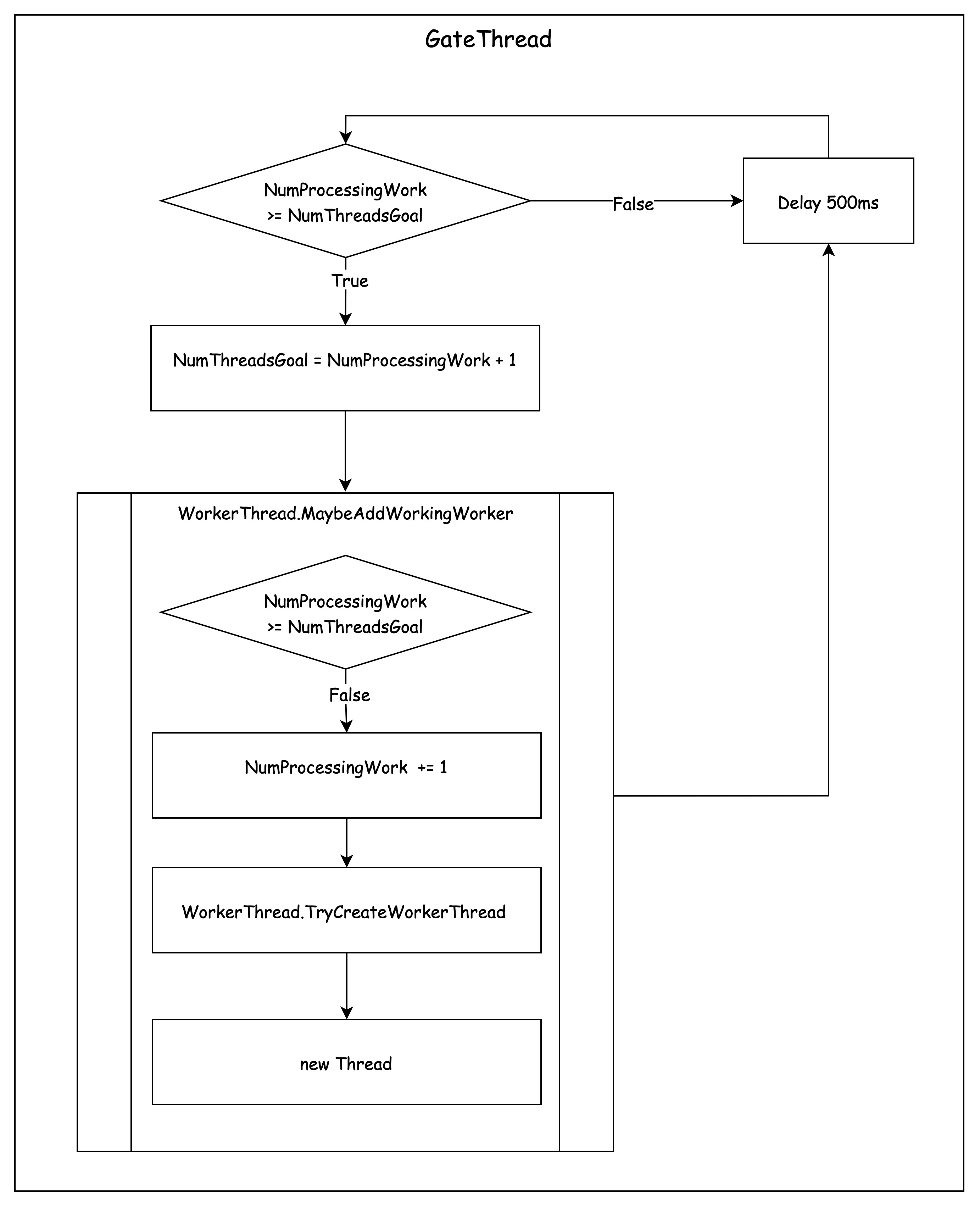 在 GateThread 是一个独立的线程,每隔 500ms 进行检查一下,如果 NumProcessingWork >= NumThreadsGoal(WorkerThread.MaybeAddWorkingWorker 不添加 Worker Thread 的判断条件),就设置新的 NumThreadsGoal = NumProcessingWork + 1,并调用 WorkerThread.MaybeAddWorkingWorker,这样新的 Worker Thread 就可以被 WorkerThread.MaybeAddWorkingWorker 创建。