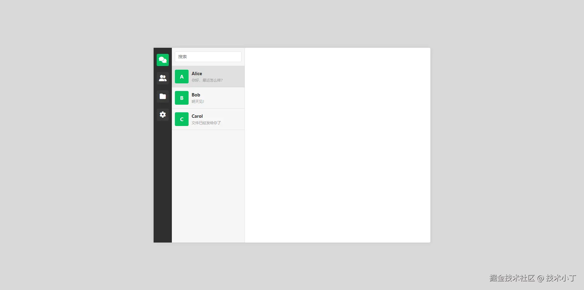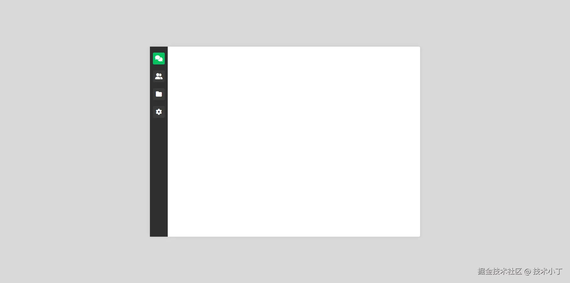 在 .container 中,添加功能区(sidebar)。它包含四个图标,分别代表:聊天会话(fa-comments)、群聊/联系人(fa-user-group)、文件管理(fa-folder)、设置(fa-gear)。