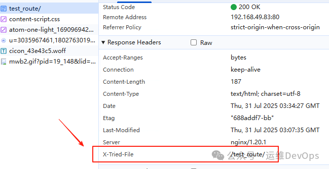 此参数的意思是在 HTTP 响应头 中新增一个自定义头字段 X-Tried-File,其值为 用户实际请求的文件路径(即 $uri 变量),查看响应头信息,可以看到X-Tried-File,如图:3、检查静态文件是否存在,不存在直接返回404,如图:请求gong.txt,既不存在此文件也不存在此目录,因此直接返回404,如图:4、访问页面,直接返回状态码,适合维护页面,如图:在abc目录下定义maintenace.html(名字要与nginx配置名字一致),然后通过192.168.49.83请求,如图:上面配置理解为:如果请求/hello,那么匹配/custom/hello,如果匹配不到就继续匹配/default/hello,如果都匹配不到就返回404(1)、在abc目录下新建custom目录并在内部创建gong.txt文件,新建default目录并在内部新建guan.txt,通过url请求,如图: