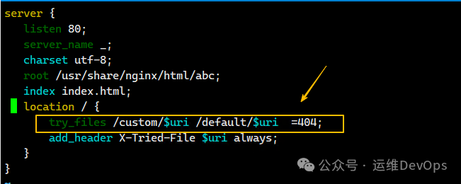 上述配置理解为:如果默认情况下什么路由都不加,那么请求到abc/index.html,如果请求的时候加了一个路由,比如 “ip/about.txt”,那么首先会查找abc路径下是否有about.txt文件,此时about.txt对应的就是"$uri",如果没有找到about.txt,那么继续查找abc路径下是否有about.txt目录,这个about.txt目录对应的就是”$uri/” ,如果有,那么就请求about.txt目录的内容,如果也没有这个目录,那么就返回默认的页面,也就是最开始的abc/index.html注:找about.txt目录下的文件默认也是index.html(1)、如果什么路径都不加,直接使用IP访问,默认会找到abc下的index.html,如图:(2)、在abc目录下定义about.txt目录,在此目录下定义index.html文件,写入内容,通过ip/about.txt访问,如图:注:因为abc目录下没有about.txt文件,但是有about.txt目录,因此跳过$uri,继续找$uri/,找到了并返回结果(3)、在abc目录下定义test.txt文件,写入内容,此时通过ip/test.txt访问,如图:此时符合了第一个$uri,因此不会继续向后面查找了(4)、直接通过ip请求未知的资源路径,ip/gong.doc,回到了默认页面,如图:因为abc路径下不存在gong.doc也不存在这个目录,因此就会找到最终的/index.html2、检查静态文件是否存在,不存在则转发到后端应用,源nginx的配置,如图:上图中的配置可以理解为如果请求的路由不匹配$uri和$uri/,那么会转发到@backend的后端服务,这个backend名称是自定义的,因此如果请求http://192.168.49.83/test_route的时候,但是本地没有对应的匹配,因此会转发到http://192.168.49.224/test_route,这个test_route会带到后端去的(1)、修改49.224的nginx配置文件,添加内容如图:注:在后端的nginx配置中,也要有这个test_route路由,否则会报404错误(2)、在/data/html目录下新建test_route目录并定义index.html文件,如图:(3)、此时通过源IP来请求test_route路由,因为当前没有匹配,就会跳转到后端服务去,如图:add_header X-Tried-File $uri always;