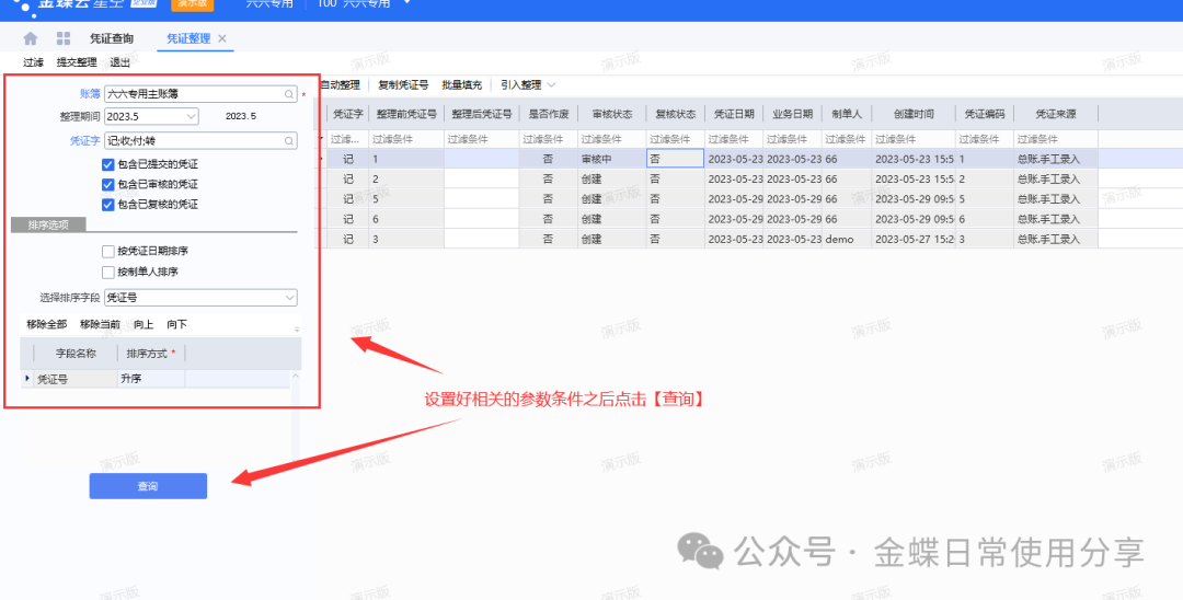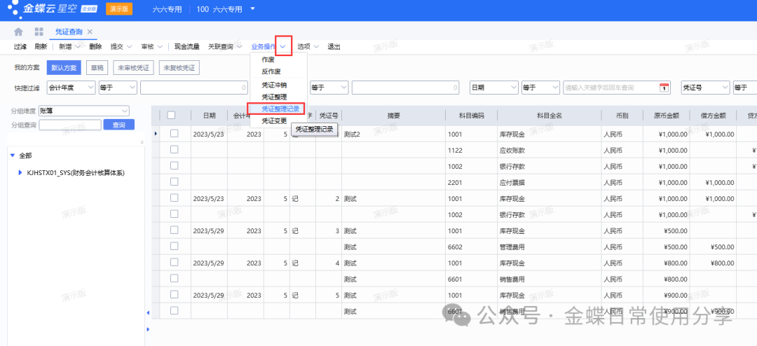 如果仅一两张断号,也可以手工调整,比如把最后一张凭证号,调整为断号凭证。如果断号较多,则可以参考下述凭证整理步骤。 【操作步骤】 1、使用有权限的用户登录金蝶云星空,进入【财务会计】-【总账】-【凭证查询】,点击【业务操作】-【凭证整理】进入【凭证整理】的界面,设置左边对应的参数之后点击【查询】,即可按照设置的条件信息查询出来参与整理的凭证显示在右边