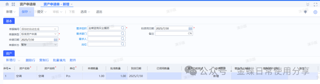 变更后资产卡片可以查看变更记录 3.4固定资产领用及借用【业务场景】:企业用户对固定资产进行领用及借用 【用户角色】:管理会计 【功能菜单】:【资产管理】->【固定资产】->【日常管理】->【资产领用】 【操作说明】:这里的固定资产领用及借用指的是资产非财务性质的进行使用部门的变化,若涉及财务物权的转移则使用固定资产挪用。 领用:首先选择货主组织,再选择资产编码,若选不到资产编码,检查货主组织,填写领用数量及领用部门,并提交审核。