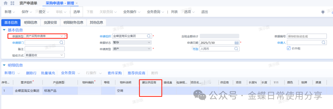 2业务数据2.1创建物料【业务场景】:企业用户资产物料的建立 【用户角色】:管理会计 【功能菜单】:【基础资料】->【主数据】->【物料】 【操作说明】:注:只有物料属性为资产的物料才能做资产申请单。 系统默认资产物料不入库,如果客户实际业务需要入库,那么在新建资产物料时一定要允许库存。 ![]() 2.2 资产申请单(可选)【业务场景】:企业用户新增资产提交申请 【用户角色】:企业用户 【功能菜单】:【资产管理】->【固定资产】->【资产请购】->【资产申请单】 【操作说明】:资产需求采购部门在系统中创建资产申请单,填写需求组织及部门、所需资产物料(物料属性为资产),数量及到货日期并提交审核。 ![]() 2.3采购申请单【业务场景】:企业用户新增资产提交采购申请单 【用户角色】:采购员 【功能菜单】:【采购管理】/【资产管理】->【采购申请-采购申请单】 【操作说明】:当需求人员做了资产申请单的情况下,首先调整采购申请单的单据类型为资产采购申请单,再通过选单的方式创建采购申请单,选择采购组织、录入推荐供应商(可选)提交审核。 ![]() 若需求人员不做资产申请单,可以直接创建采购申请单来达到申请的需要,单据类型为资产采购申请单,手动填写资产申请组织及部门、采购组织、物料、数量、到货日期、及建议供应商(可选)并提交审核。 ![]() 2.4 采购订单【业务场景】:企业用户新增采购订单 【用户角色】:采购员 【功能菜单】:【供应链】->【采购管理】->【采购申请】->【采购申请列表】->【下推采购订单】 【操作说明】:采购员填写单价并提交审核。 ![]() 2.5采购收料【业务场景】:企业用户进行采购收料操作 【用户角色】:采购员 【功能菜单】:【供应链】->【采购管理】->【订单处理】->【采购订单列表-下推操作】 【操作说明】:采购订单下推收料通知单,若实际业务需要入库且该资产物料设置了允许库存,则填写仓库,否则直接提交审核,没有入库动作的直接看2.8。 ![]() 2.6采购入库【业务场景】:企业用户进行采购入库操作 【用户角色】:采购员 【功能菜单】:【供应链】->【采购管理】->【收料处理-收料通知单列表】->【下推操作】 【操作说明】:提交审核 ![]() 2.7资产出库【业务场景】:企业用户需要资产出库 【用户角色】:仓储员 【功能菜单】:产品路径:【供应链】->【库存管理】 ->【杂收杂发】->【其他出库单】 【操作说明】:已入库的资产在领用时需要进行出库处理,新增其他出库单,更改单据类型为资产出库,填写领用部门、物料编码、实发数量、发出仓库等信息并提交审核。 ![]() 2.8资产卡片【业务场景】:企业用户需要新增资产,资产信息以卡片的形式记录 【用户角色】:管理会计 【功能菜单】:【资产管理】->【固定资产】->【日常管理】->【资产卡片】 【操作说明】:新增资产卡片,选择正确的资产组织及货主组织(资产组织和货主组织可以不相同即管理资产的组织与实际所有权所属的资产组织不一致,资产组织必须有资产职能,货主组织可以没有资产职能。),选择资产类型后再点击“选单”关联采购收料单或其他出库单。 ![]() 根据实际需求填写卡片,若一个使用组织使用多个会计政策,则需要在每种政策下,填写财务信息。
