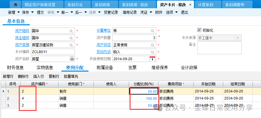 若资产卡片存在一物多分配的情况,则在使用分配页签中,针对资产编码设定分配比例。一个资产编码分配比例加一起应该为100%。