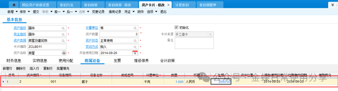 若还有附属设备、发票内容、维修保养需要记录,都可以放在附属设备、发票、维护保养页签中,此处仅作为管理需求存在,不影响财务计算。