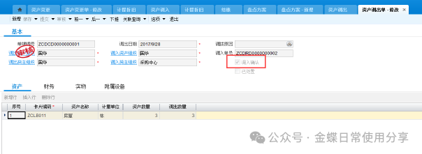调入方调入后,系统会在资产调出单中勾选调入确认,以确认调入