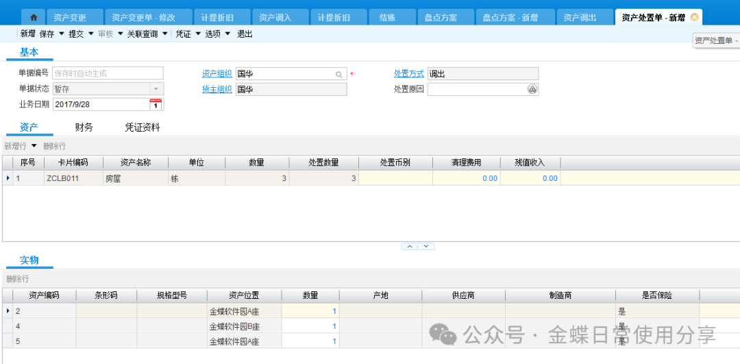 如果资产调出后需要处理,通过资产调出单下推资产处置单。