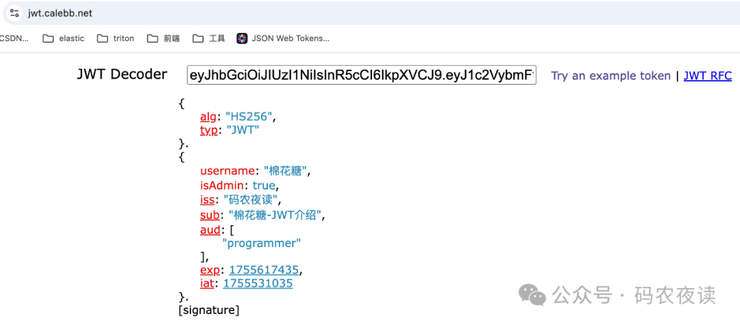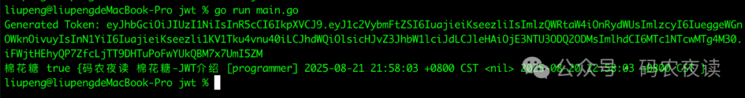func main() { token := jwt.NewWithClaims(jwt.SigningMethodHS256, Claims{ Username: "棉花糖", IsAdmin: true, RegisteredClaims: jwt.RegisteredClaims{ Issuer: "码农夜读", Subject: "棉花糖-JWT介绍", Audience: []string{"programmer"}, ExpiresAt: jwt.NewNumericDate(time.Now().Add(24 * time.Hour)), IssuedAt: jwt.NewNumericDate(time.Now()), }, }) tokenString, err := token.SignedString(jwtKey) if err != nil { panic(err) } println("Generated Token:", tokenString)}