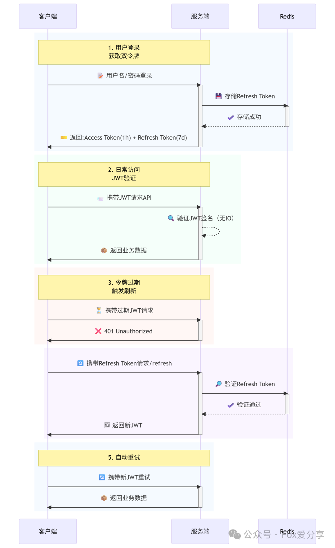 Refresh Token有效后,签发一个全新的Access Token,返回给客户端。 - 无感重试客户端拿到新的
