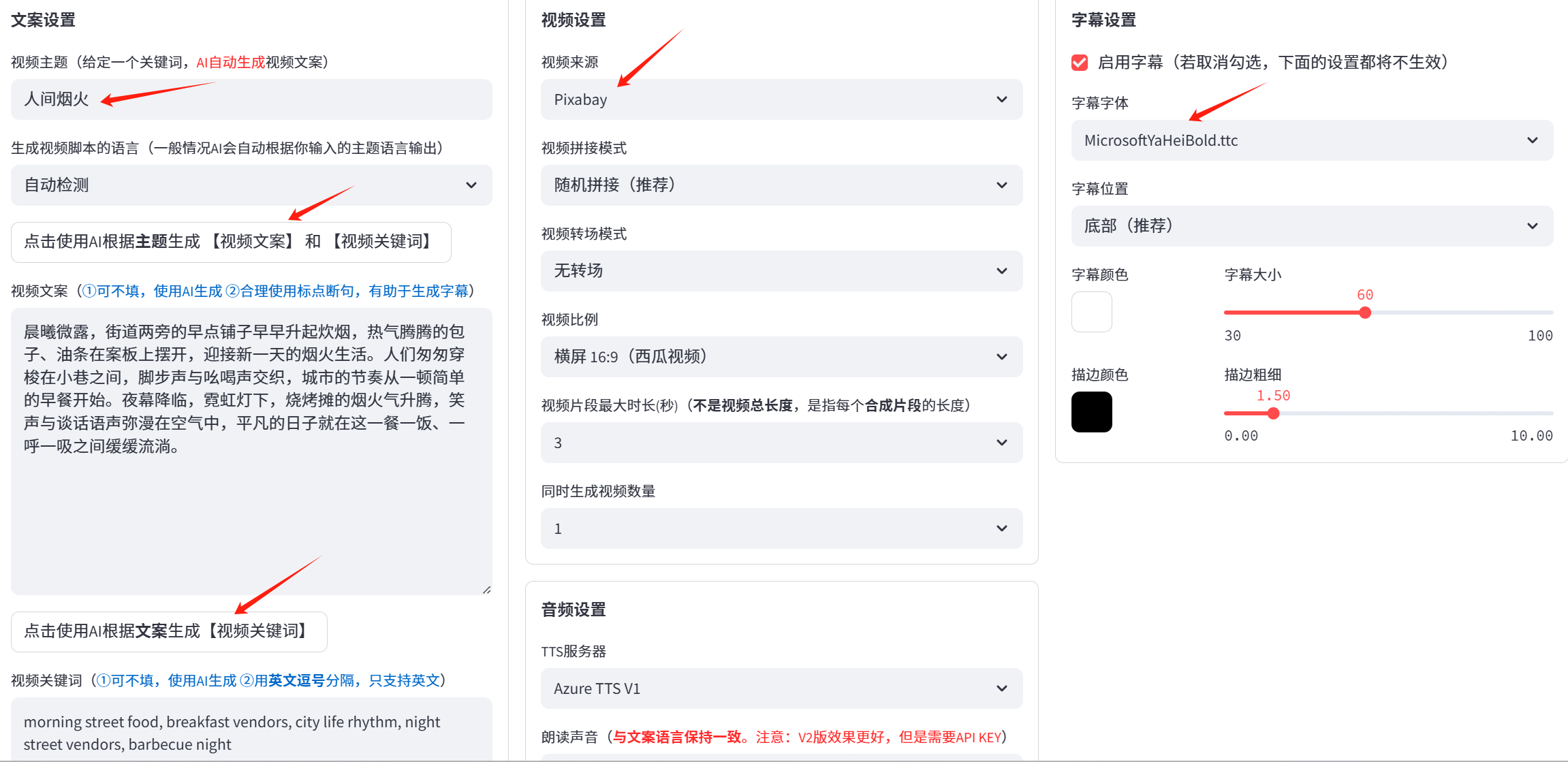 文案设置视频主题:人间烟火,你可以输入别的主题。 视频文案:这里直接AI生成,你可以手动输入。最好还是AI生成,自然一点。 视频关键词:这里直接AI生成,只支持英文 视频来源:选择Pixbay,最好选这个,国内网络可以使用。 启用字幕:默认启用,默认字体即可。
