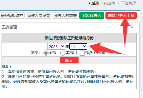 可删除重复记录,前往工资导入,在右上角点击删除已导入工资,选择年月点击删除。 如果该月存在审核过的记录,就需要先反审,具体是前往工资审核,找到已审核的记录点反审,再回到上面的位置删除。 ![]() 该文章在 2025/11/3 8:46:58 编辑过  |