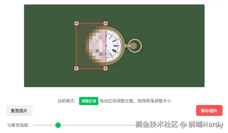 移动区域:点击 mosaicArea(非手柄)时触发 isMoving,鼠标移动时计算偏移量,更新区域位置并重新应用马赛克;